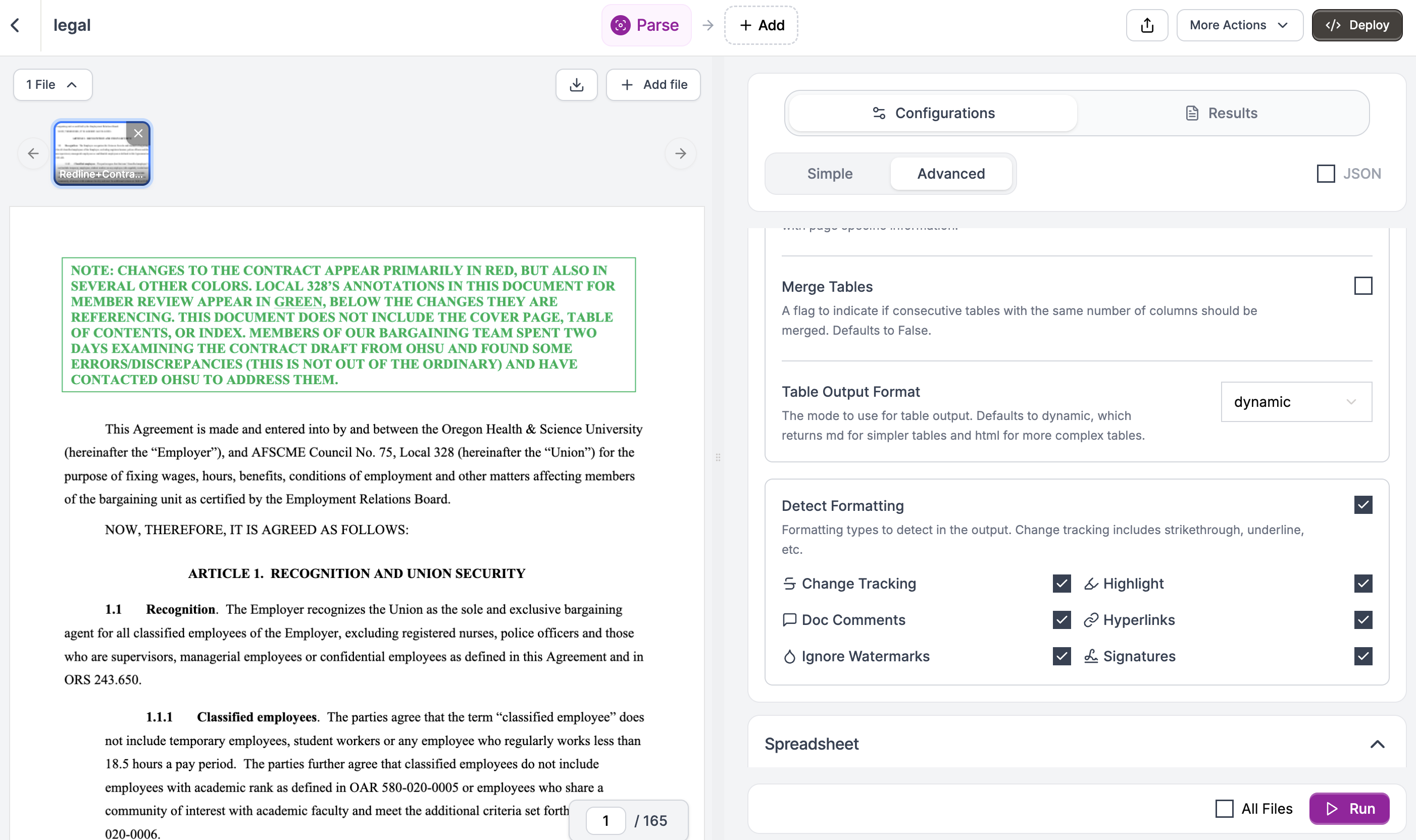 First, upload your redlined contract to Reducto:Parse with change tracking enabled