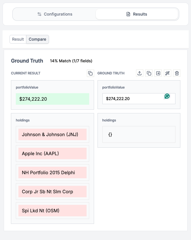 The Compare tab lets you validate extraction accuracy against known correct values. This is essential for testing schema changes before deploying to production. Studio shows a side-by-side comparison: your current result on the left, ground truth on the right. Matching values appear in green; mismatches appear in red. The header shows your match percentage (e.g., â17% Match (1/6 fields)â).