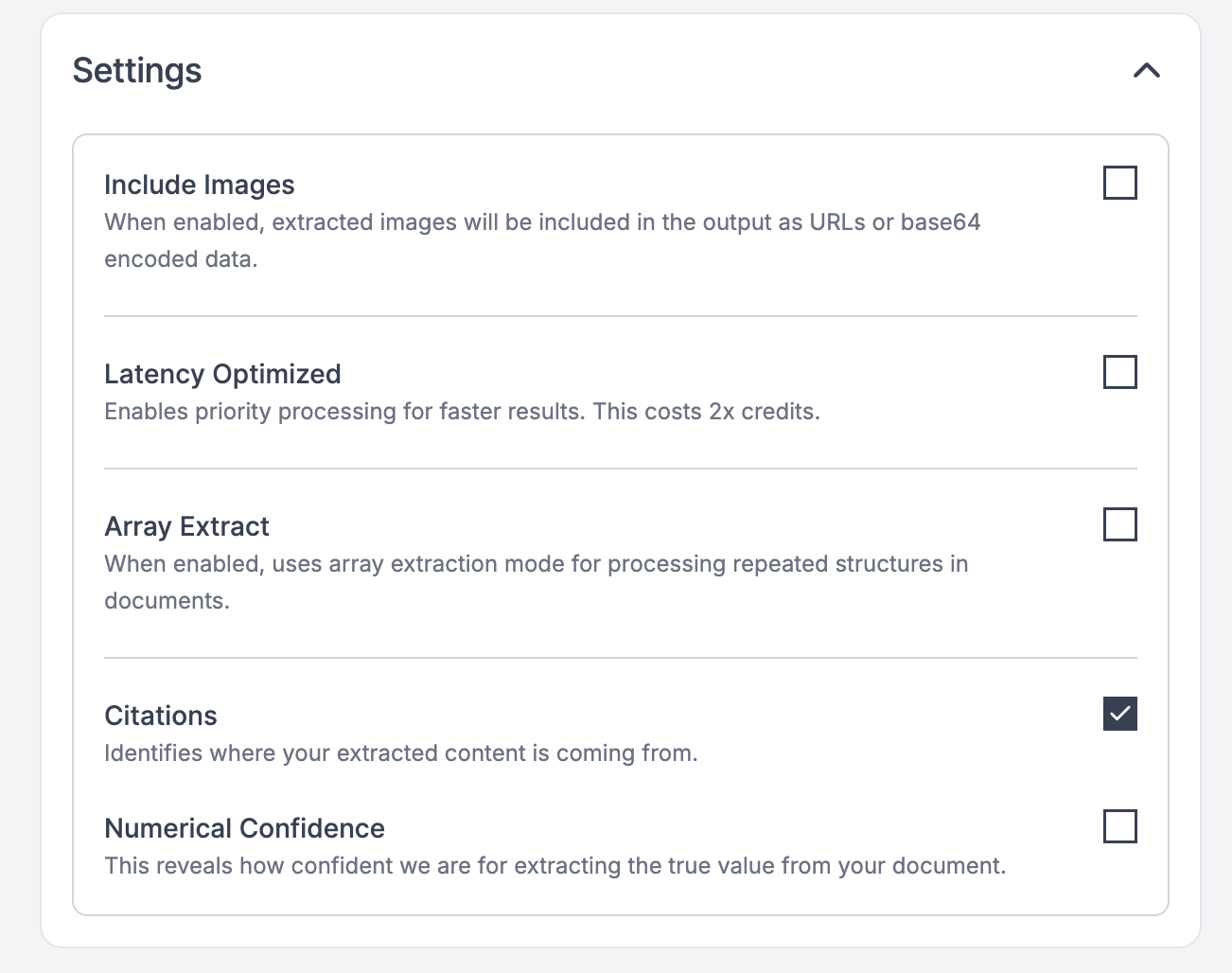 For long documents with many items (hundreds of transactions, extensive line items), enable array extraction. Without it, the LLM may only process the beginning of the document due to context limits.